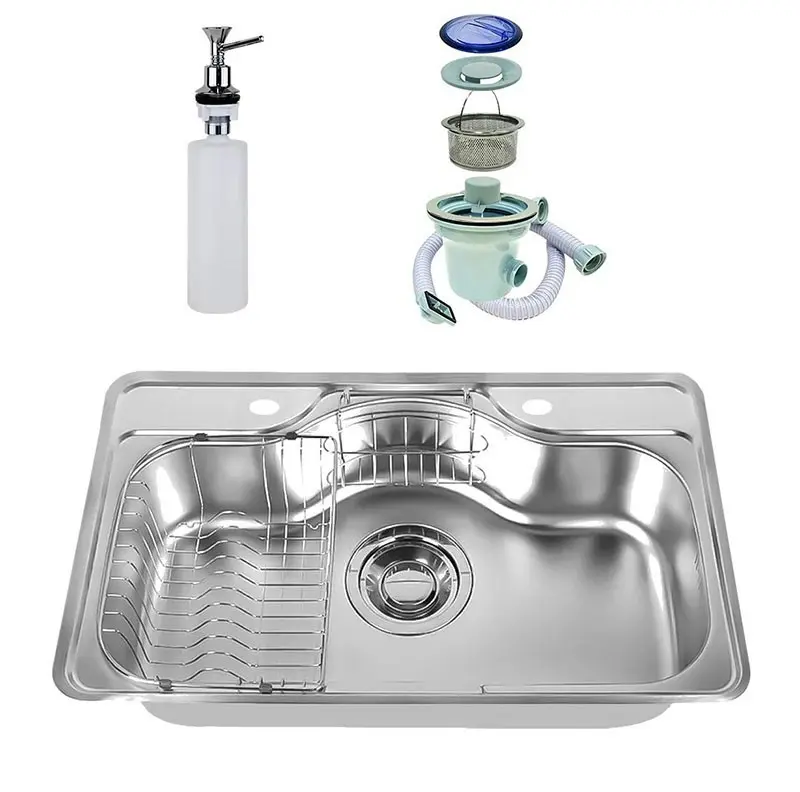 حوض مطبخ استانلس ستيل كورينا NJIS 750 PF شفه فلات 75 × 48 × 19 سم بالصرف 6 بوصة سُمك 0.8 مم ضاغط صابون وصفاية للاطباق وللملاعق وللمنظفات